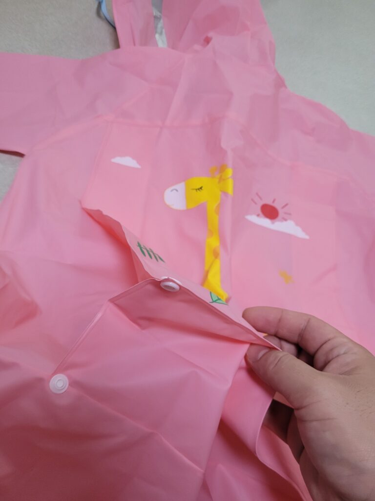 이 제품의 또 다른 장점은 버튼이 간단해서 아이 스스로 입고 벗을 수 있다는 점입니다. 보통 우비는 뻑뻑하거나 지퍼 타입이라서 아이 혼자 다루기 힘든 경우가 많은데, 이 우비는 버튼이 부드럽게 여닫혀서 자주성을 길러주는 데도 도움이 되더군요. 아침마다 서두르지 않고, 아이 스스로 우비를 챙겨 입는 모습이 꽤 뿌듯했습니다.